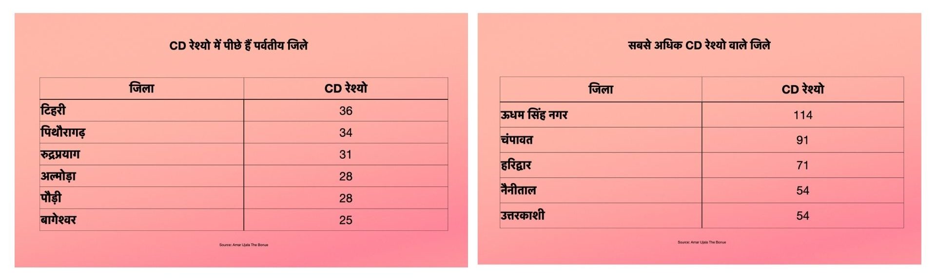 राज्य के कई पर्वतीय जिलों का सीडी रेस्यो 40% से भी कम है। मतलब ये है कि लोग बैंकों में जो भी पैसा जमा कर रहे हैं, उसका बड़ा हिस्सा मैदानी जिलों के उद्योग एवं खेती में उपयोग किया जा रहा है। सीडी रेश्यो वो आंकड़ा होता है जो बताता है कि बैंक अपने कुल जमा धन का कितना हिस्सा कर्ज के रूप में बांट रहा है। इसका ज्यादा होना आर्थिक सक्रियता और निवेश के अच्छे संकेत माने जाते हैं। पहाड़ी जिलों में यह संकेत कमजोर हैं जिससे पता चलता है कि यहां पर आर्थिक गतिविधियां और निवेश के अवसर काफी सीमित हैं। दूसरी तरफ, मैदानी जिलों में निवेश को लगातार बढ़ावा मिल रहा है और ये सीडी रेश्यो से साफ नजर आता है।